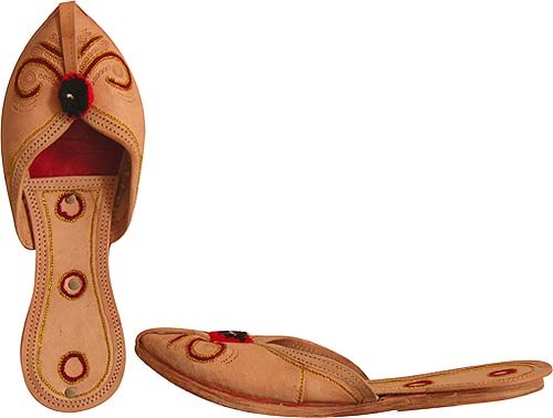 Punjab and Rajasthan has a rich and long tradition of leather crafts. Each village had its families of leather workers. The juti, mojari or pagarkhi are leather shoes and slippers worn by both men and women of all communities. The mojari is tanned with vegetable dye and has excellent thermal insulation quality. The process of production starts with cutting the leather with a sharp knife both for the upper and the sole. Stuck together with home made glue, they are stitched with cotton or leather thread. The upper is then embroidered by the women whose finesse as they embroider these shoes is a treat to watch. The embroidery is done directly on leather using cotton, silk or woolen threads depending on the material used for the upper surface. Bright colors, traditional motifs and contemporary designs are the primary themes. The stitching is finally strengthened by hammering. Beads and appliqué works are also becoming very popular. Actual gemstones are no longer used as they were used once.There is no right and left shoe, khussa shoes mold to the exact shape of your foot upon breaking in becoming extremely comfortable. Shoes are designed to be worn in the traditional way with your toes all the way to the tip of the shoe. If you like extra room in the toe area, size up. Size up for half sizes or for wide widths (if you are an 8.5, you should get a 9).