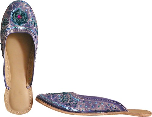 Punjab and Rajasthan has a rich and long tradition of leather crafts. Each village had its families of leather workers. The juti, mojari or pagarkhi are leather shoes and slippers worn by both men and women of all communities. The mojari is tanned with vegetable dye and has excellent thermal insulation quality. The process of production starts with cutting the leather with a sharp knife both for the upper and the sole. Stuck together with home made glue, they are stitched with cotton or leather thread. The upper is then embroidered by the women whose finesse as they embroider these shoes is a treat to watch. The embroidery is done directly on leather using cotton, silk or woolen threads depending on the material used for the upper surface. Bright colors, traditional motifs and contemporary designs are the primary themes. The stitching is finally strengthened by hammering. Beads and appliqué works are also becoming very popular. Actual gemstones are no longer used as they were used once.There is no right and left shoe, khussa shoes mold to the exact shape of your foot upon breaking in becoming extremely comfortable. Shoes are designed to be worn in the traditional way with your toes all the way to the tip of the shoe. If you like extra room in the toe area, size up. Size up for half sizes or for wide widths (if you are an 8.5, you should get a 9).