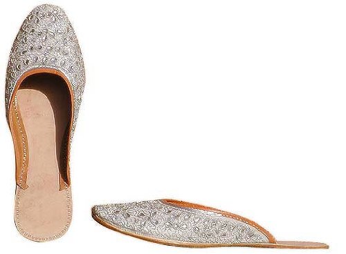 Punjab and Rajasthan has a rich and long tradition of leather crafts. Each village had its families of leather workers. The juti, mojari or pagarkhi are leather shoes and slippers worn by both men and women of all communities. The mojari is tanned with vegetable dye and has excellent thermal insulation quality. The process of production starts with cutting the leather with a sharp knife both for the upper and the sole. Stuck together with home made glue, they are stitched with cotton or leather thread. The upper is then embroidered by the women whose finesse as they embroider these shoes is a treat to watch. The embroidery is done directly on leather using cotton, silk or woolen threads depending on the material used for the upper surface. Bright colors, traditional motifs and contemporary designs are the primary themes. The stitching is finally strengthened by hammering. Beads and appliqué works are also becoming very popular. Actual gemstones are no longer used as they were used once.There is no right and left shoe, khussa shoes mold to the exact shape of your foot upon breaking in becoming extremely comfortable. Shoes are designed to be worn in the traditional way with your toes all the way to the tip of the shoe. If you like extra room in the toe area, size up. Size up for half sizes or for wide widths (if you are an 8.5, you should get a 9).