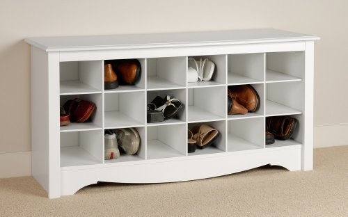 Prepac is a successful designer and manufacturer of functional and stylish RTA (ready to assemble) home furniture. Our RTA product categories include Bedroom Furniture Audio-Video Furniture Media Storage Entryway Furniture Office Furniture Utility Storage and Kitchen Cabinets. Doesn t it make sense to have your shoes stored in the same place as you put them on? This dual purpose product is a bench with shoe storage so everything is right where you need it. It s a great addition to a front entranceway mudroom or utility room. Each of the 18 individual cubbies measures 63/4 w x 51/2 h x 133/4 d (large enough to hold a pair of size 13 men s shoes). Constructed from high quality laminated composite woods with profiled top side moldings and arched kick plate. Assembled Dimensions: 48 W x 24 H x 16 D